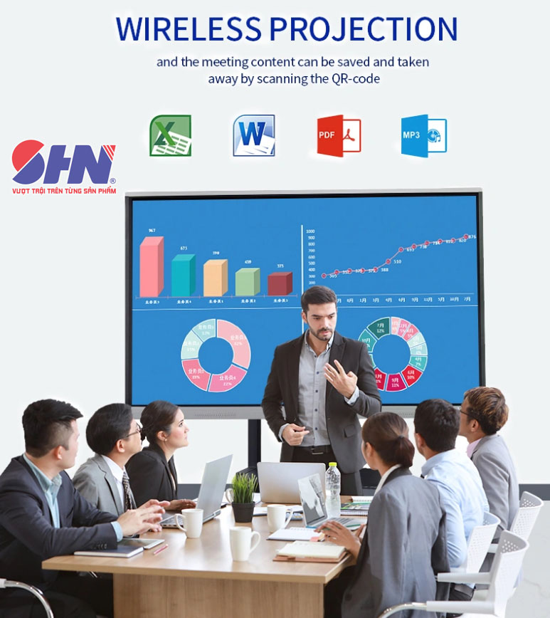 Chỉ với một cú chạm duy nhất, gửi nội dung bảng trắng và ý tưởng mới truyền từ trung tâm đến các trang web từ xa. Hãy thưởng thức việc truy cập tới tất cả các công cụ kết nối với màn hình. Cuộc họp trực tuyến được thực hiện trong chất lượng sắc nét, độ phân giải 1080p Full HD, chia sẻ nội dung 4K, tạo cảm giác như đang gặp mặt trực tiếp. Với 2 loa mạnh mẽ 15W, bạn sẽ có trải nghiệm âm thanh thực và tự nhiên mỗi lần sử dụng. Giờ đây mọi hoạt động tương tác trở thành hiện thực trong thế giới thực.
